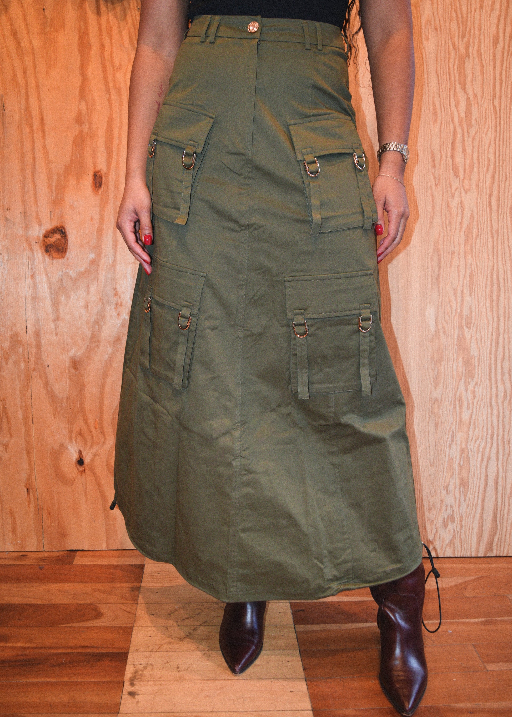 Meet the Arlina Cargo Skirt featuring oversized cargo pockets and a bungee cord perfect to adjust the fit and flare of the skirt. Keep the cord loose for an A line style or Pull the cord tight for a rounded skirt. Perfect for year round wear.