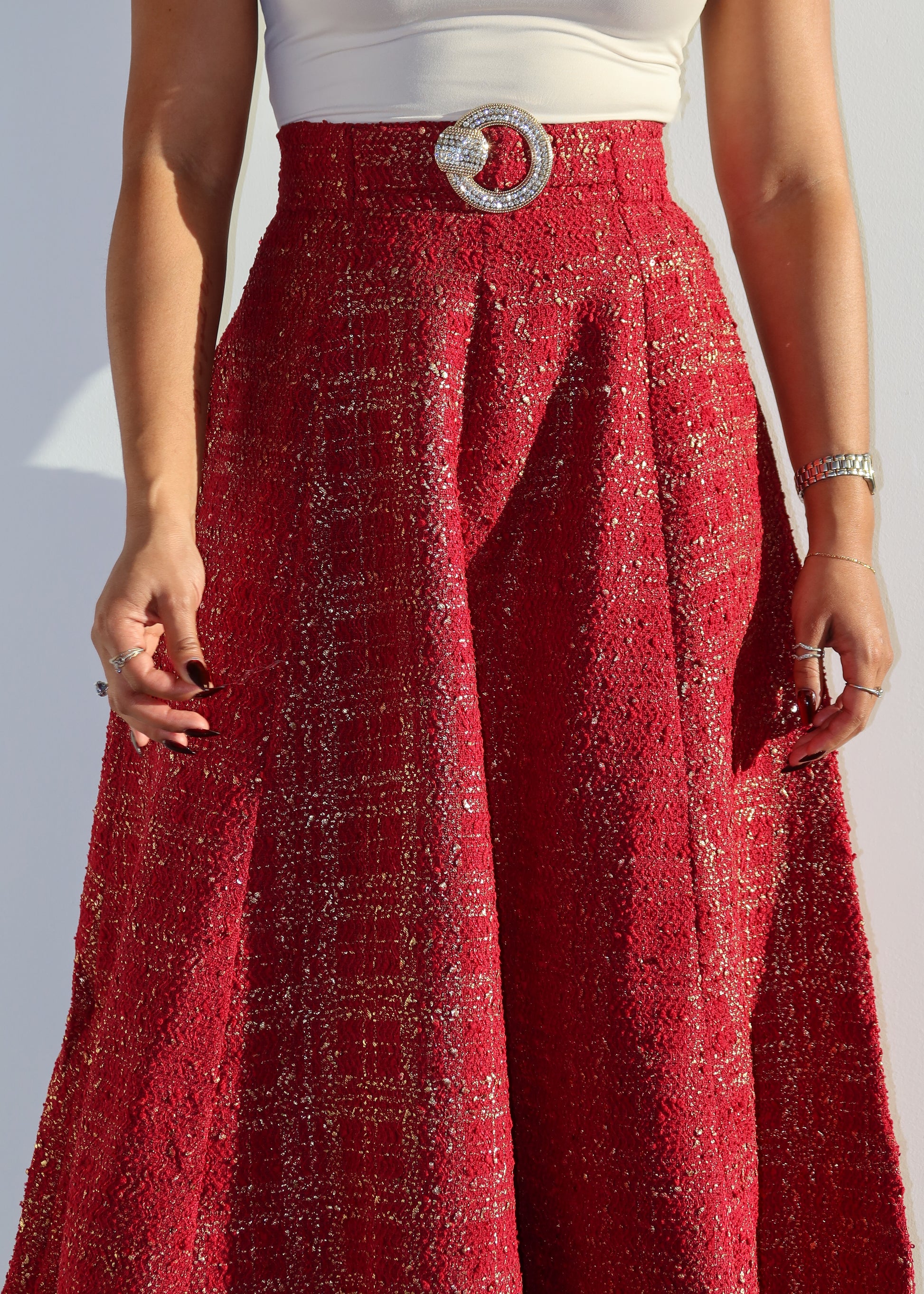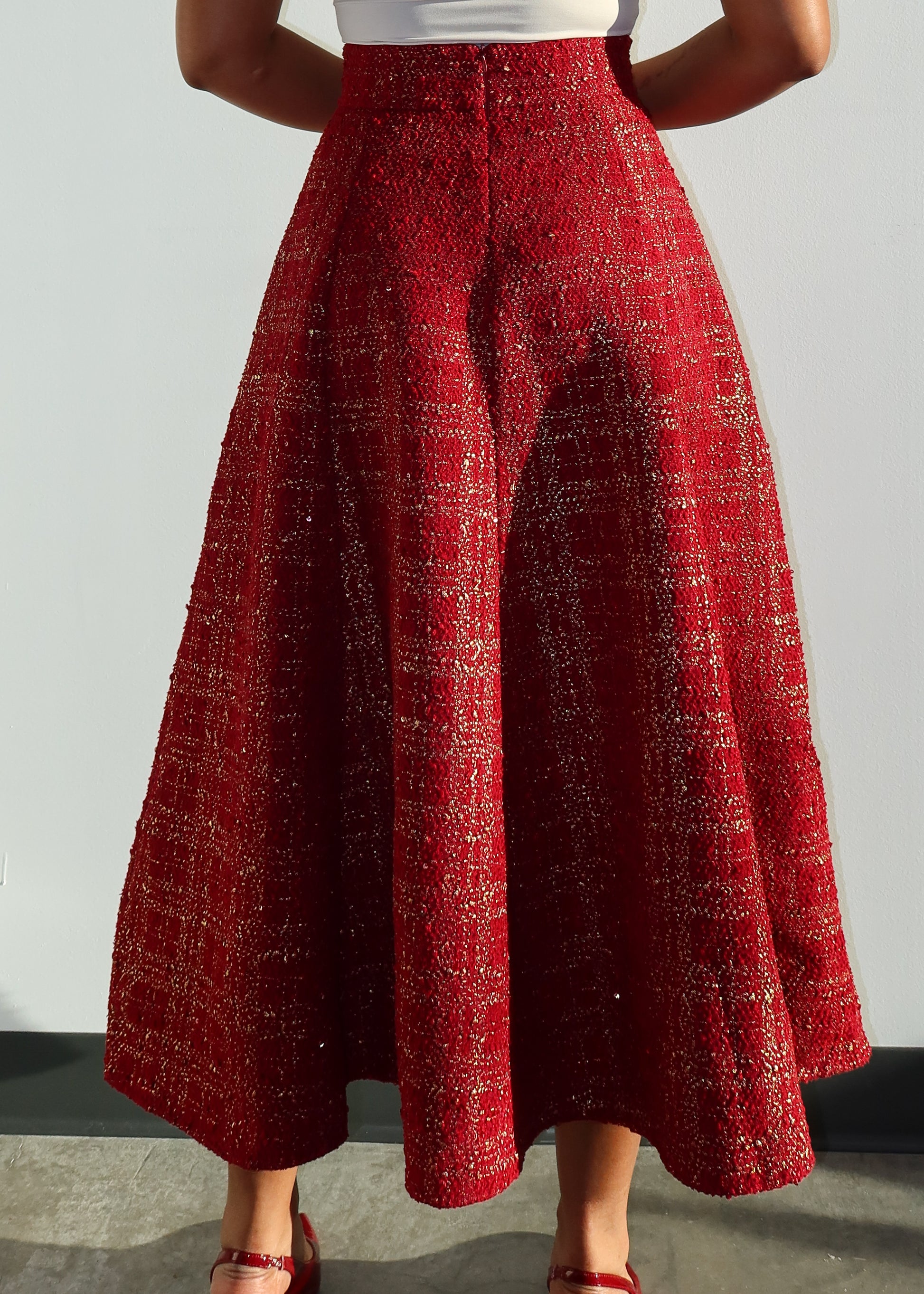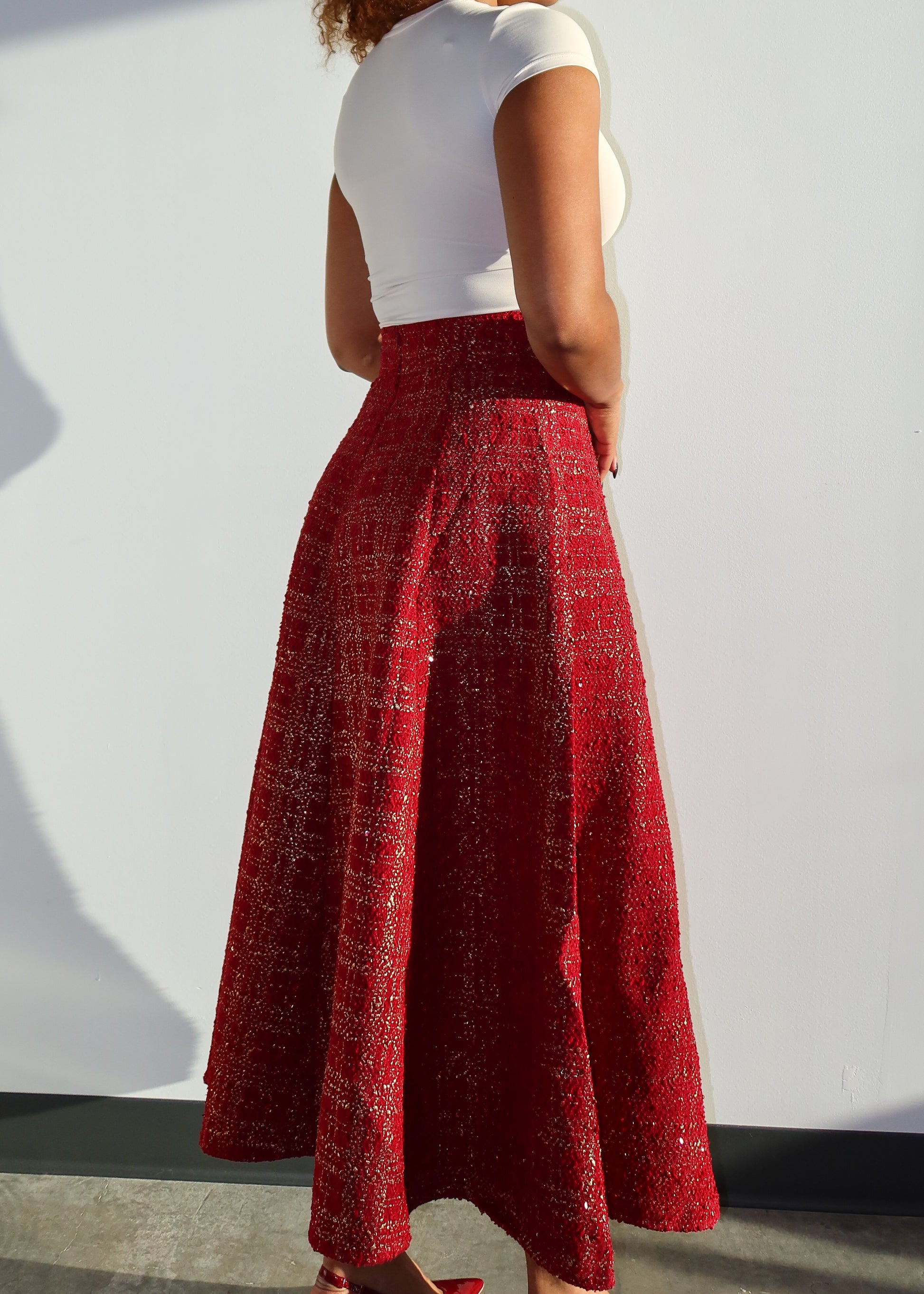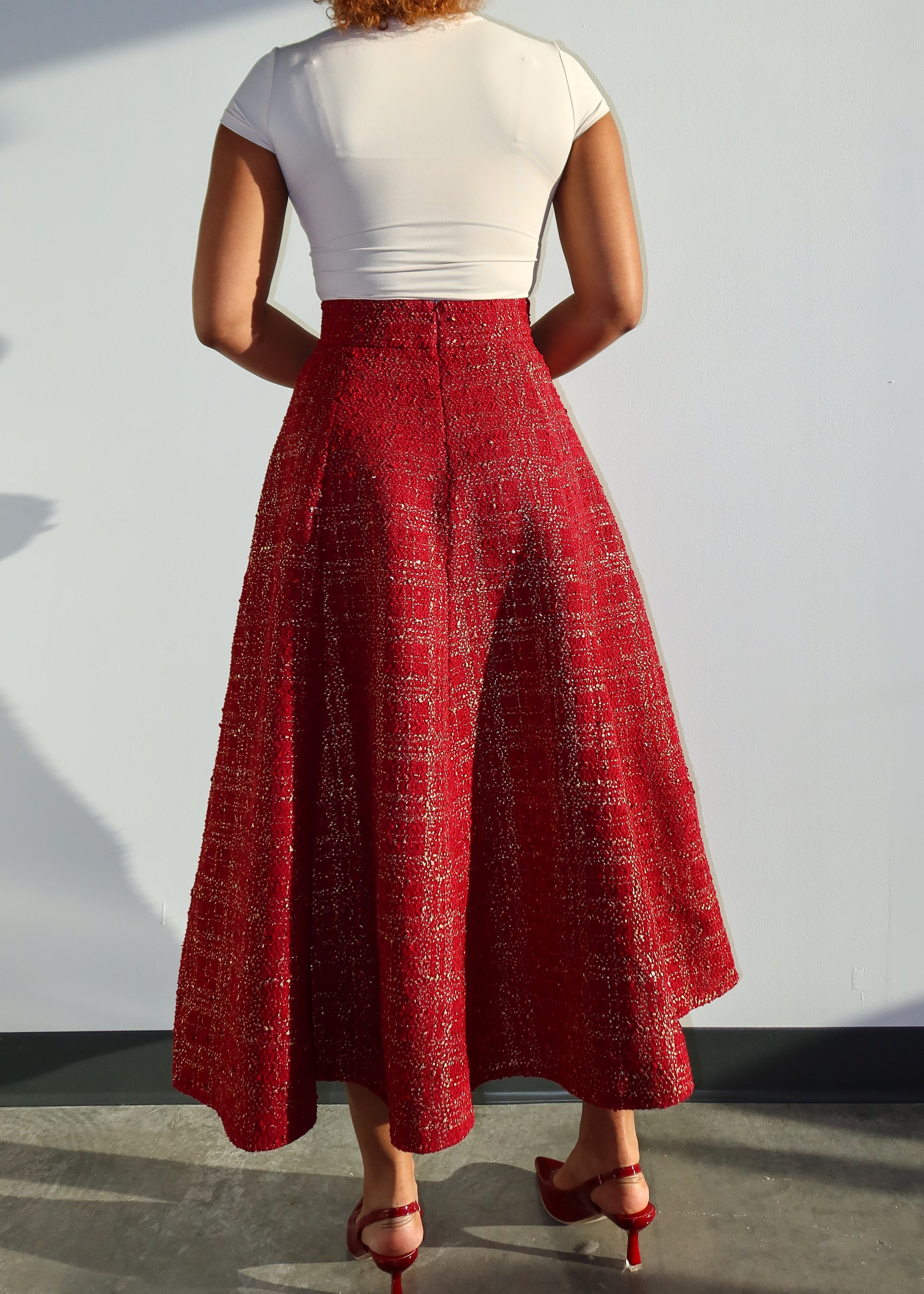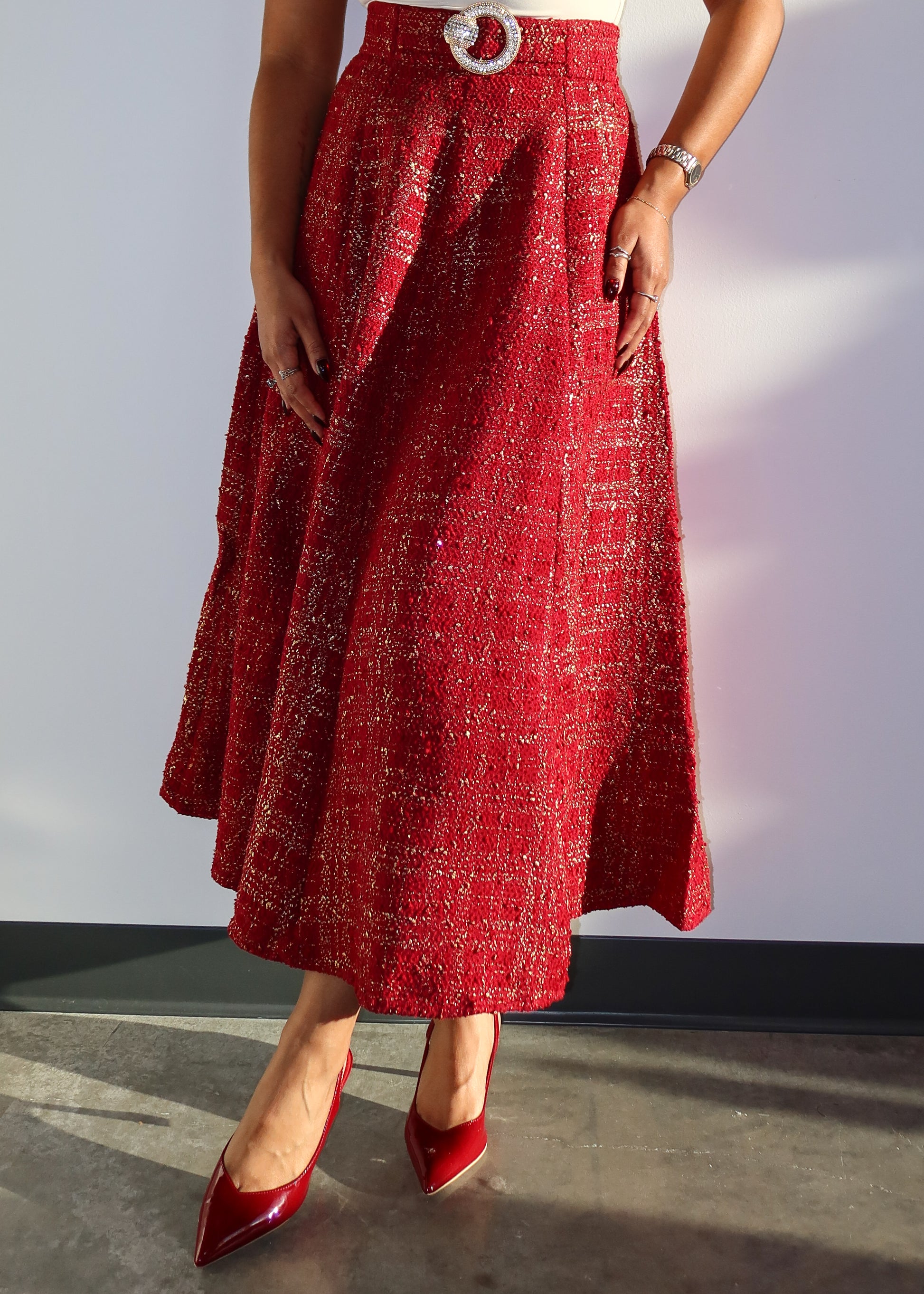 The Bailey Tweed Skirt features a high waisted A-Line shape with red tweed and gold accents. Perfect for the Holiday Season or just to wear around town with a bodysuit and cardigan.