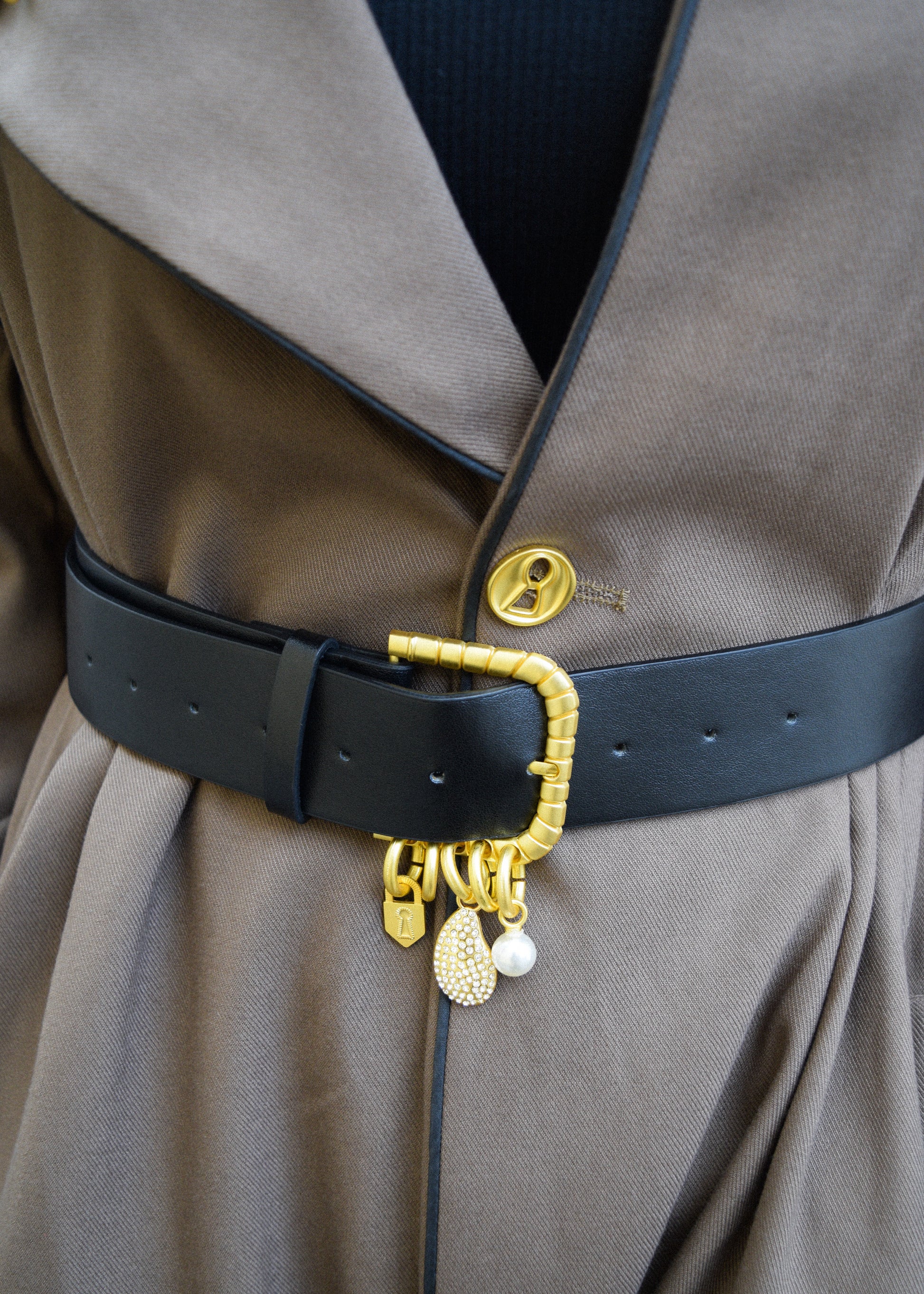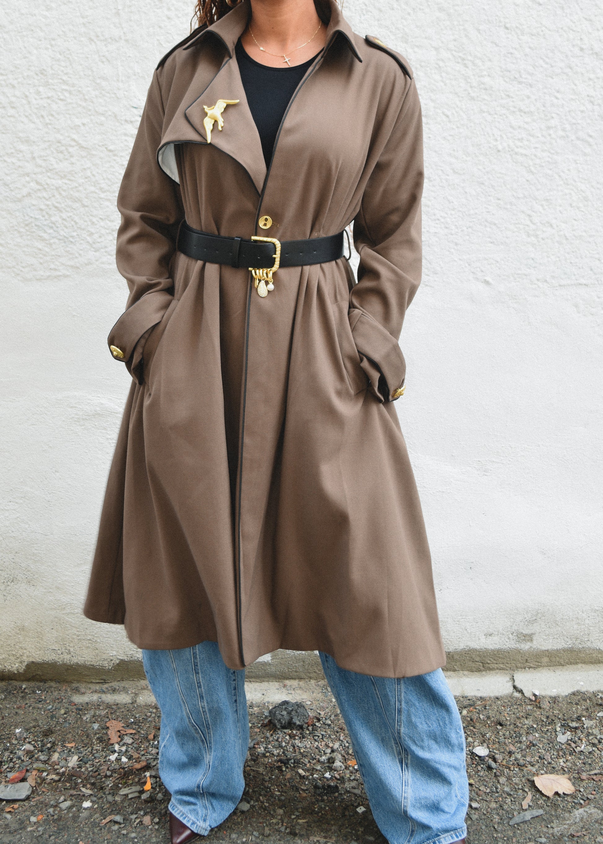 This chocolate long trench coat is the perfect addition to your fall wardrobe. The coat features a gold bird brooch, belted waist detail, and a long flowy bottom. It can be paired with jeans or slacks to complete a perfect fit for a day at the office, brunch with friends, or walk in the park.