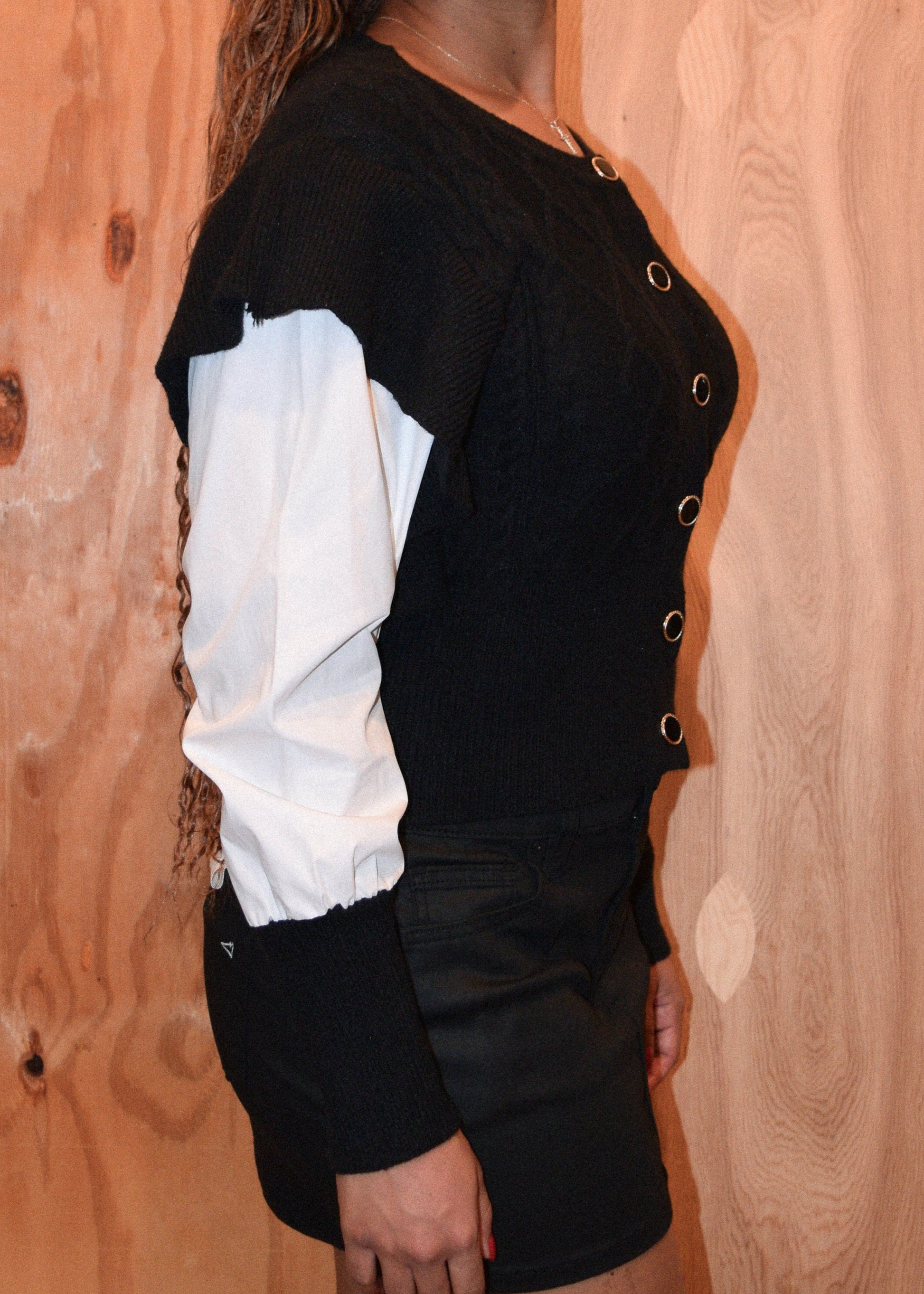 Meet the Adira Sweater, a hybrid between a class white button down and a sweater vest. This sweater is perfect for winter events where you still want to look professional and put together but with some added visual interest and flair.
