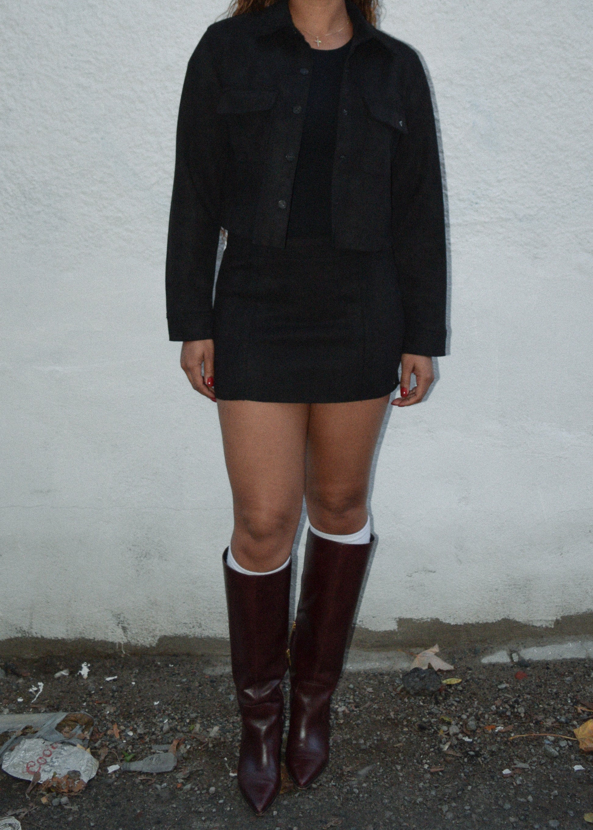 What should I wear with it? Rosalie Suede Shacket, Tights, Boots, Bodysuit