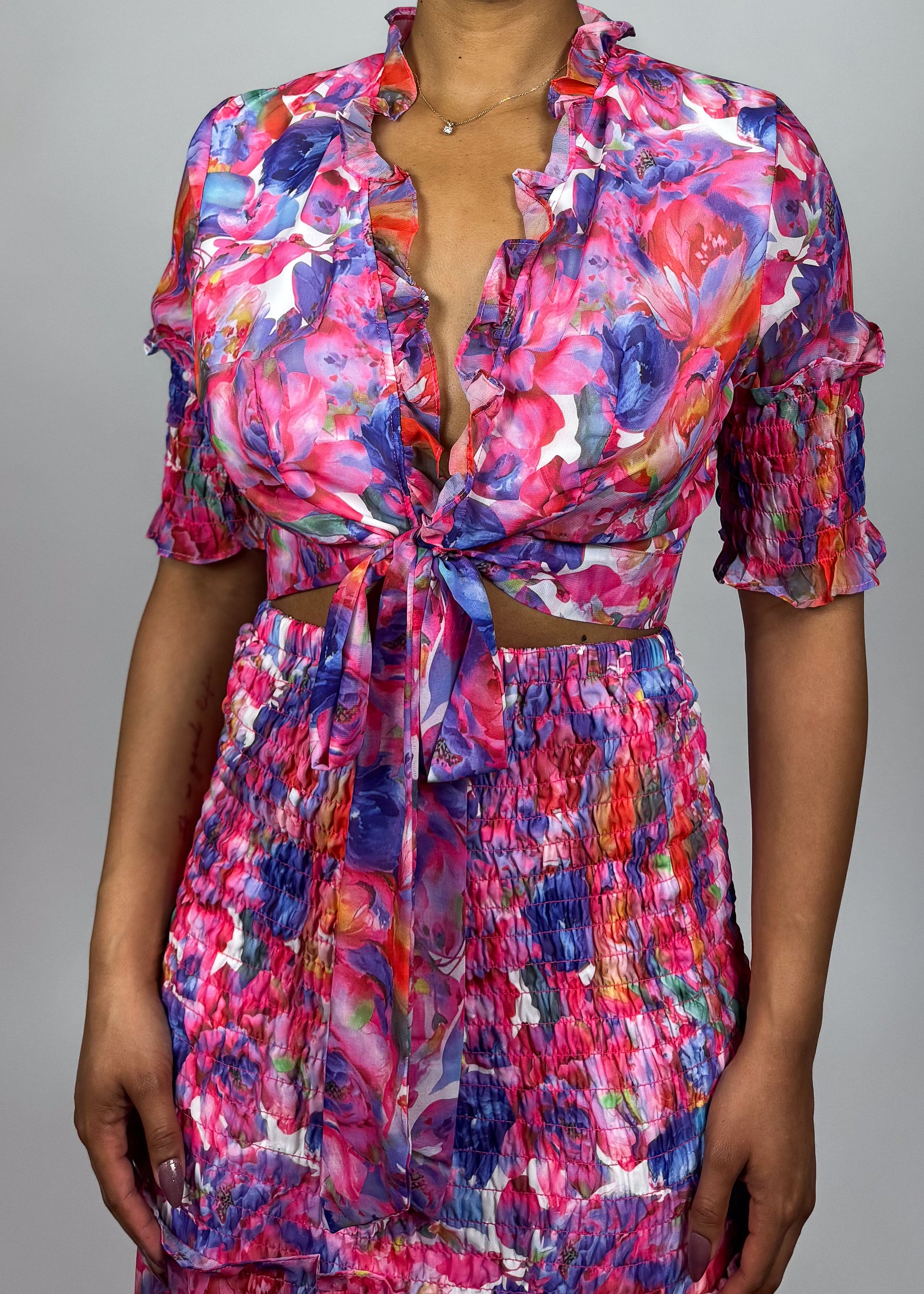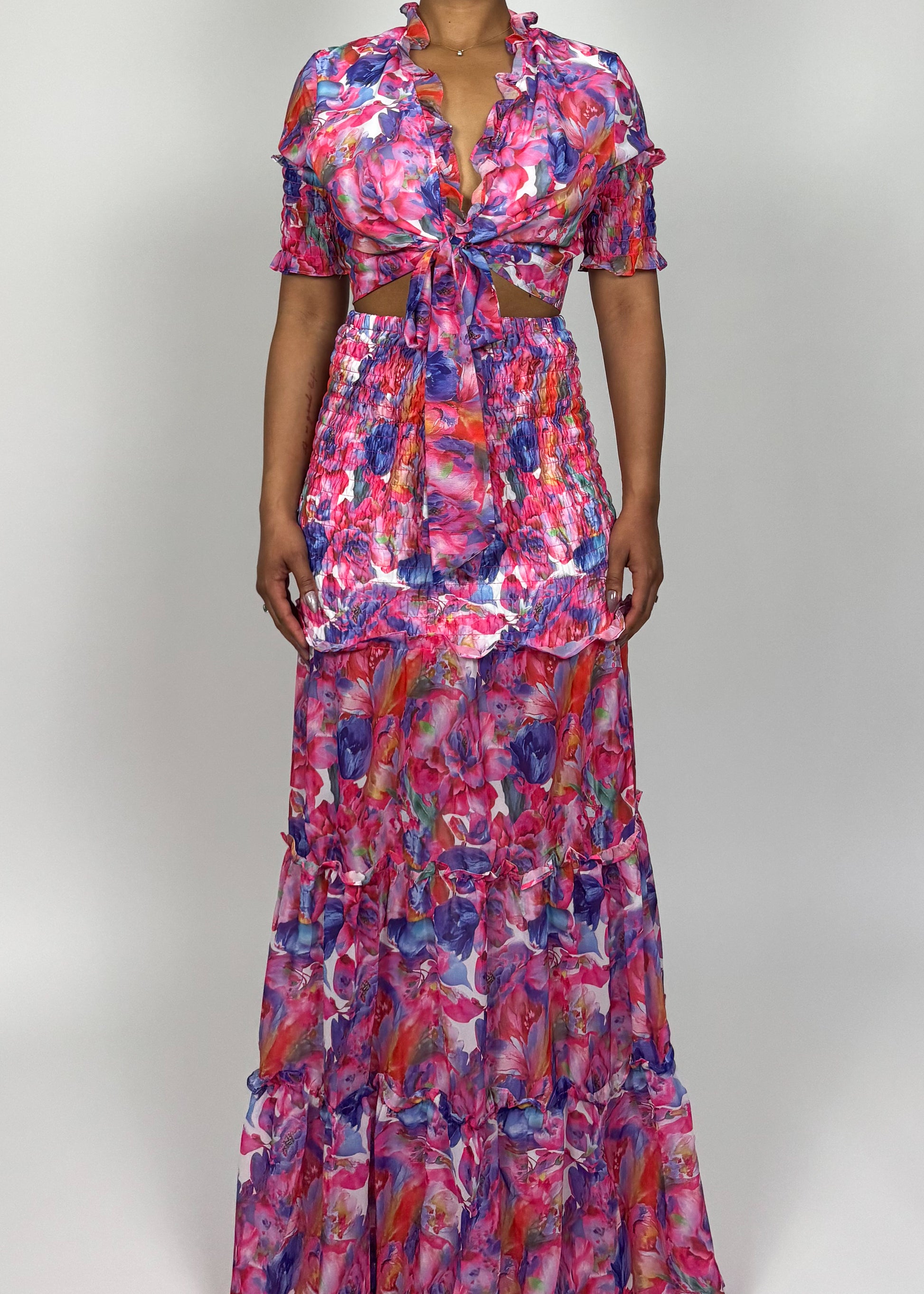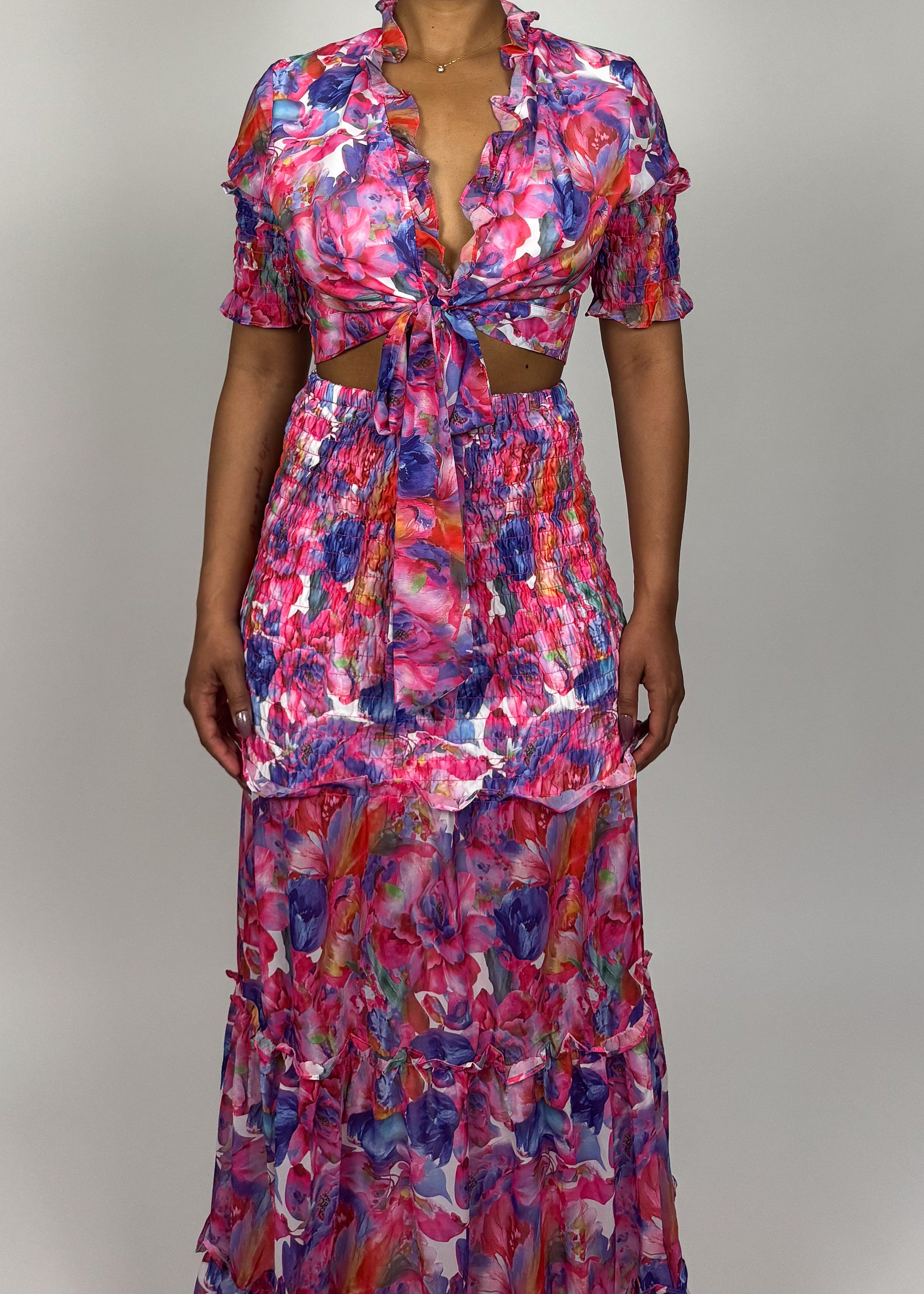Elevate your wardrobe with our Two-Piece Floral Set, featuring hues of pink, white, and purple. This set includes a short sleeve tie top and a high-waisted skirt with 3-panel design. The top offers ruching for added stretch and a unique textured design, ensuring both comfort and style. The beautiful floral design resembles a garden in full bloom, evoking feelings of freshness and beauty.