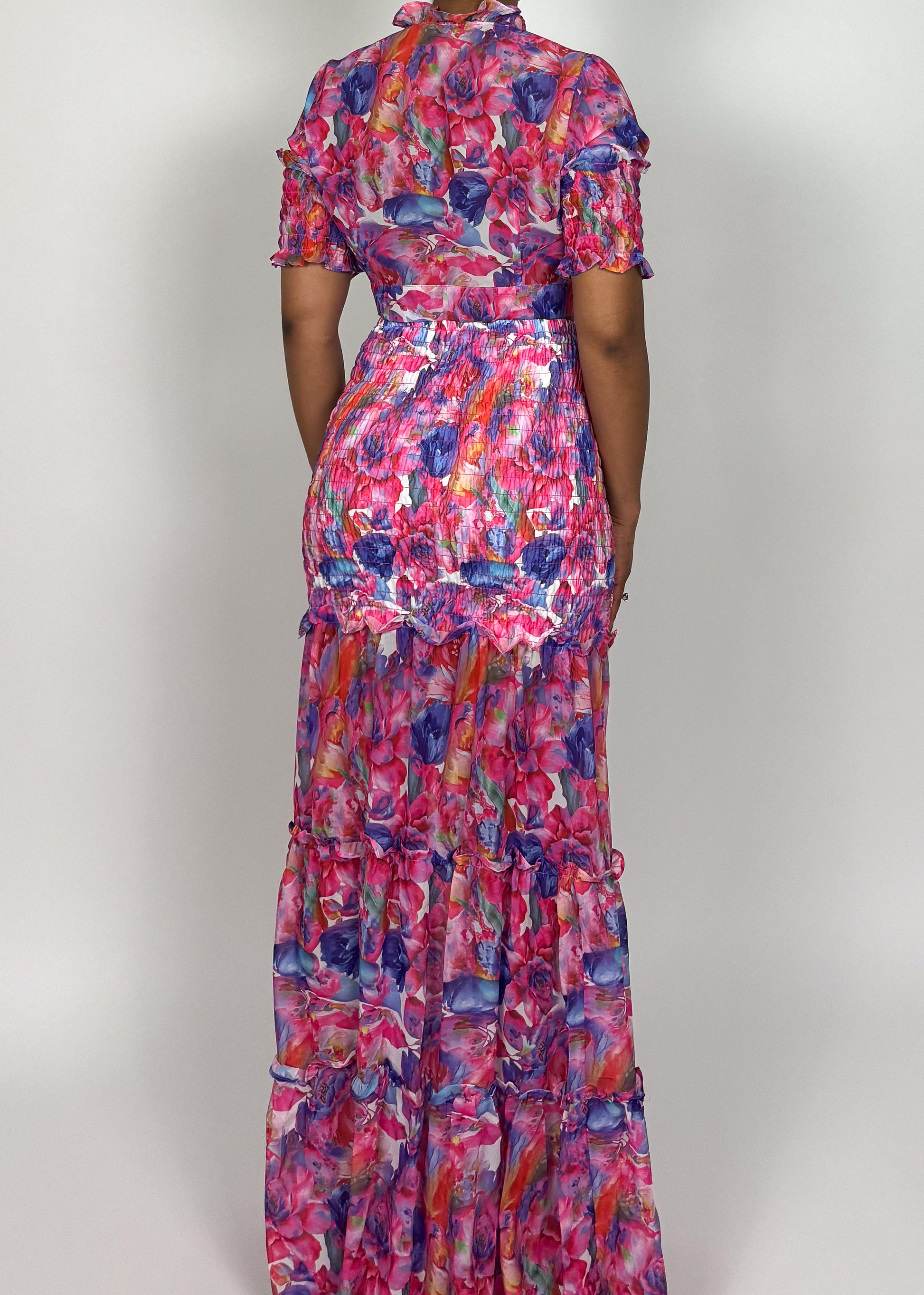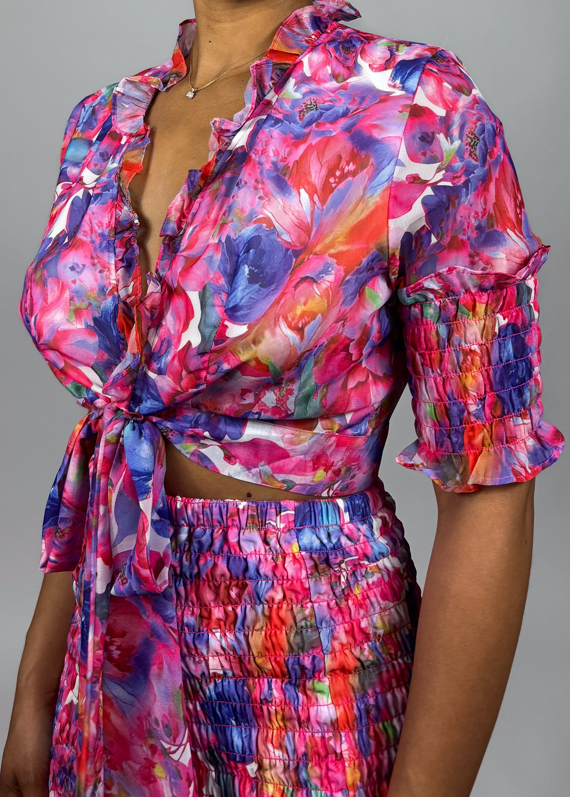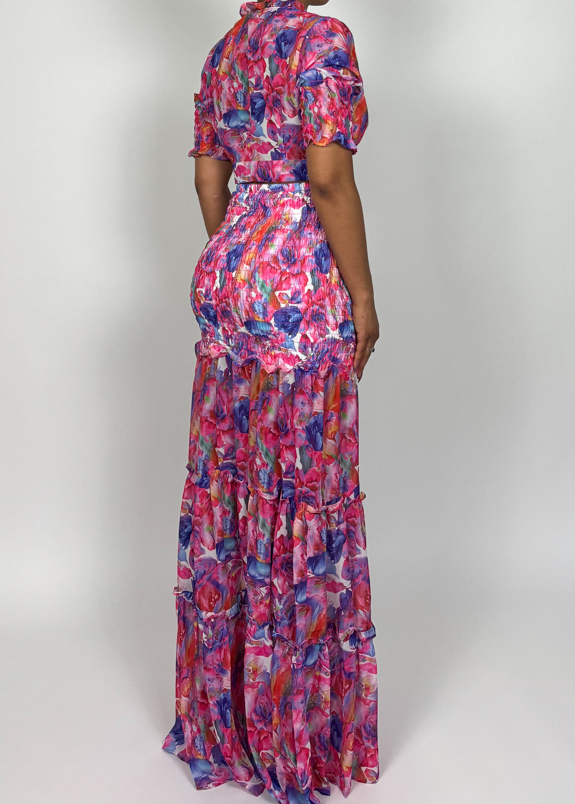 Elevate your wardrobe with our Two-Piece Floral Set, featuring hues of pink, white, and purple. This set includes a short sleeve tie top and a high-waisted skirt with 3-panel design. The top offers ruching for added stretch and a unique textured design, ensuring both comfort and style. The beautiful floral design resembles a garden in full bloom, evoking feelings of freshness and beauty.