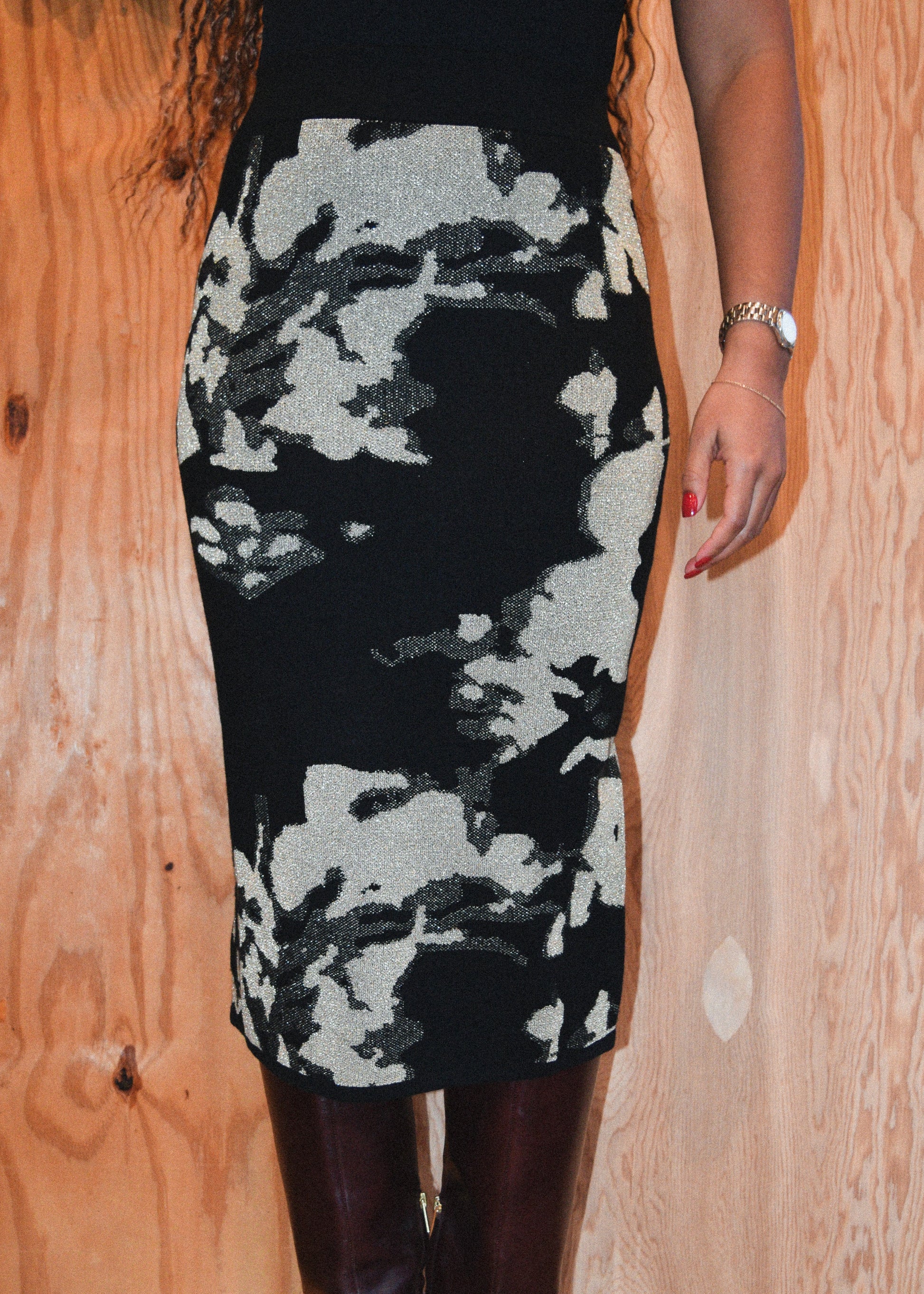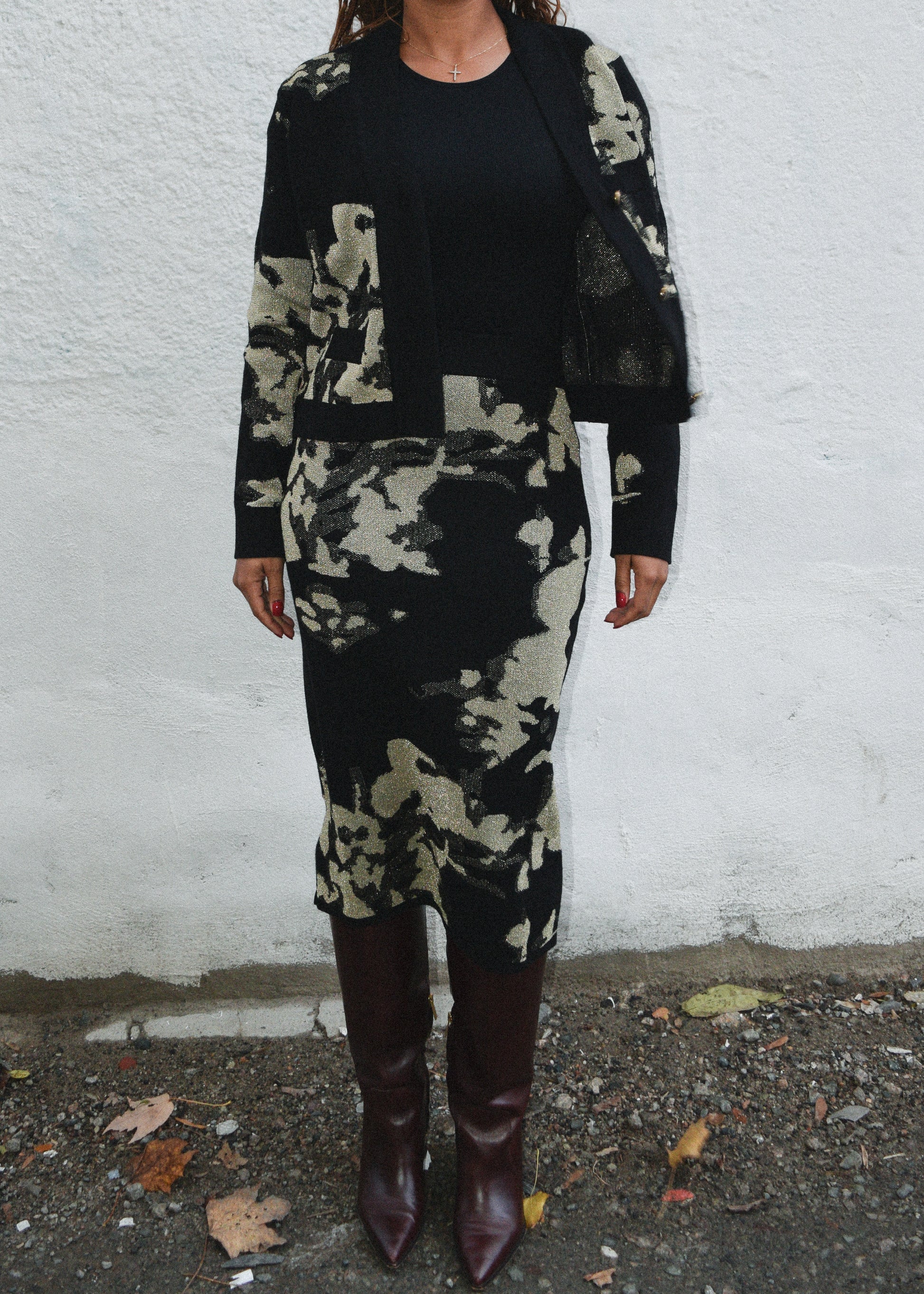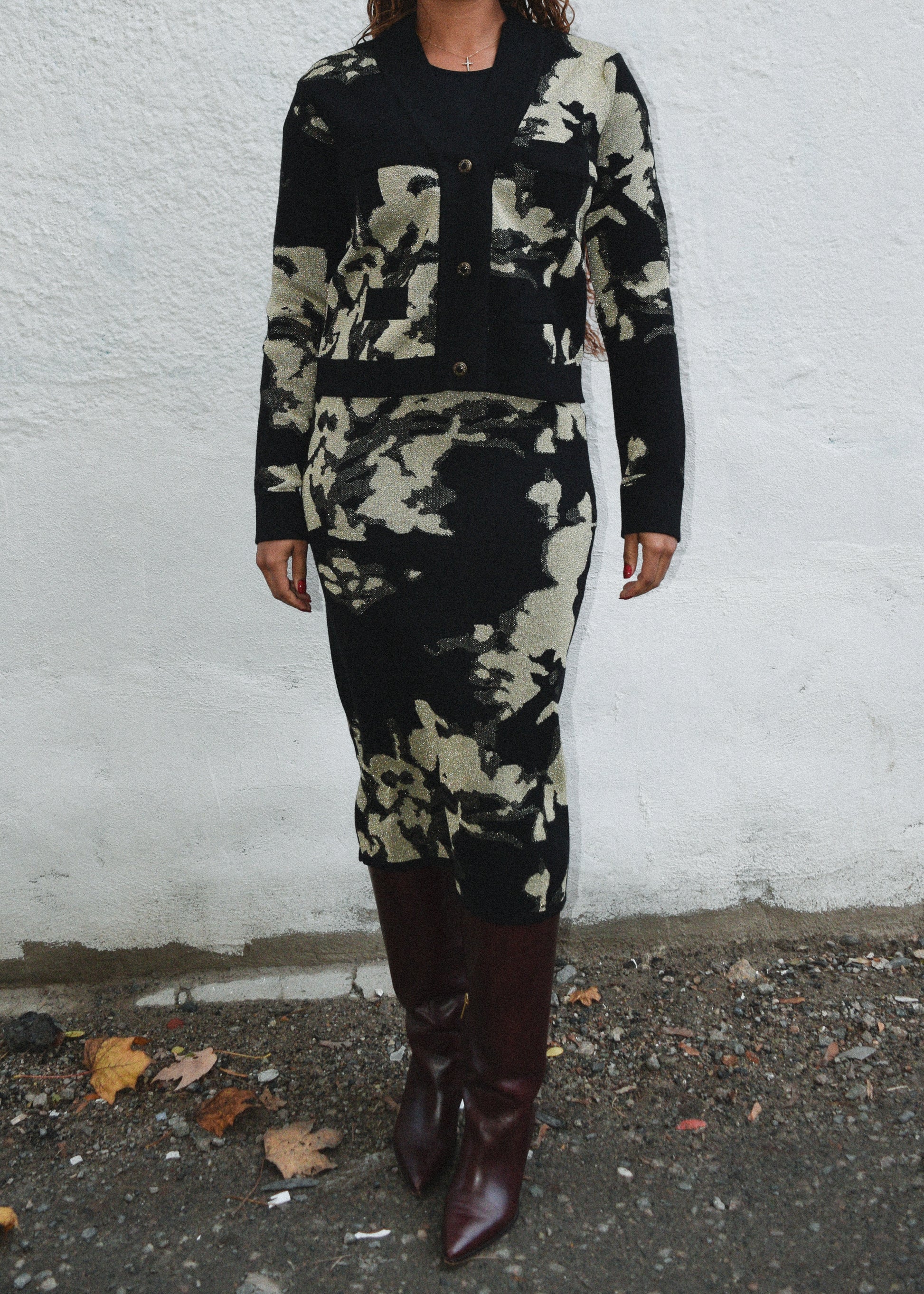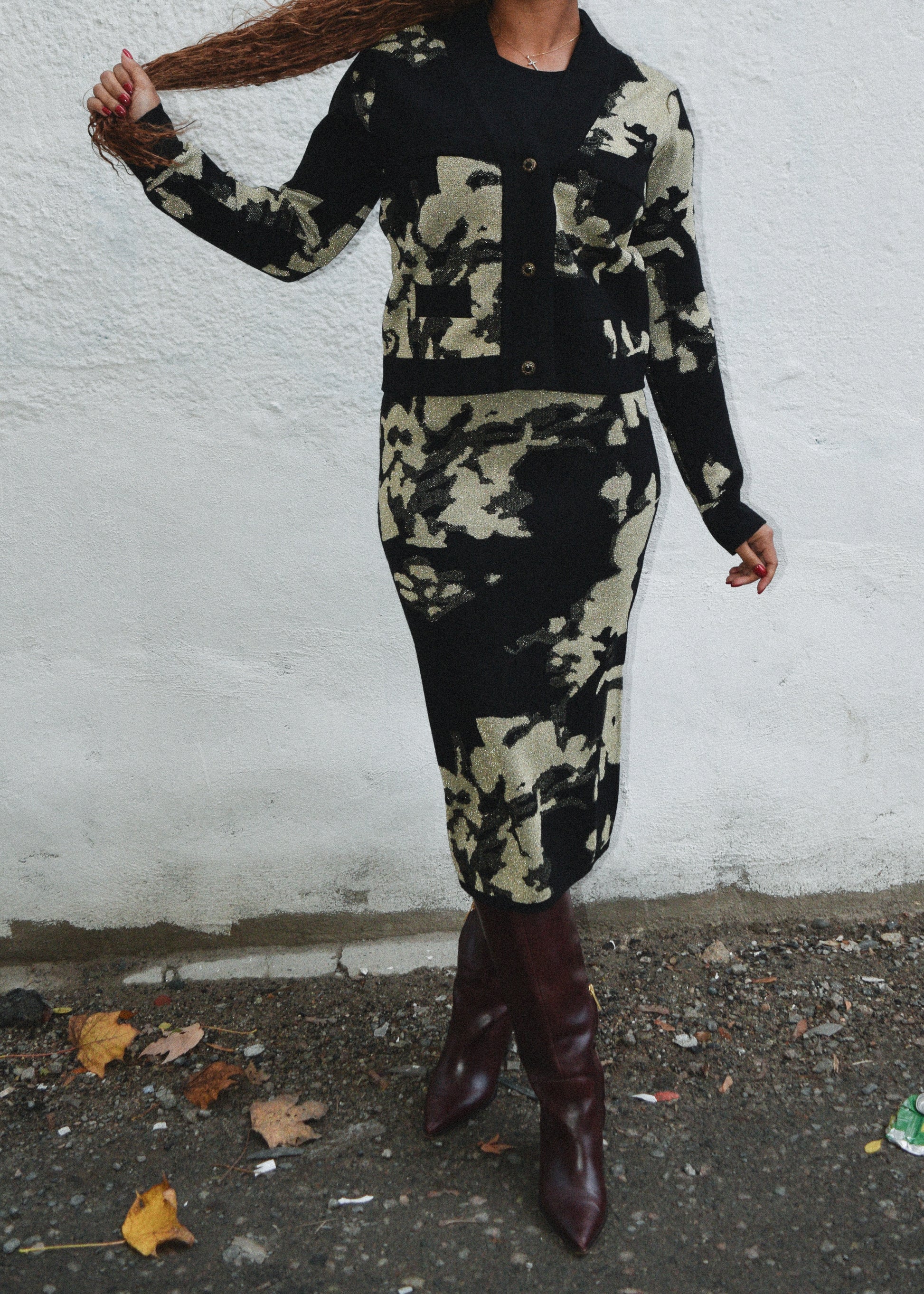 You know we love a set and all of its mix and match potential! Meet the Serene Knit Set featuring a cardigan and high waisted skirt falling just below the knee. The multicolored set features shimmery black and green hues. Wear the set together or separate the pieces with jeans, sweaters, and trousers.